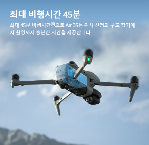 - 비행 시간: Air 3S는 최대 45분의 비행 시간을 제공하며, DJI O4 HD 동영상 전송 기술을 통해 최대 20km 거리에서 고화질 영상을 전송할 수 있습니다