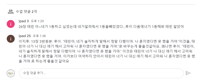 아이들은 글을 읽고 바꾸고 싶은 부분에 대해 코멘트를 달게 합니다 .