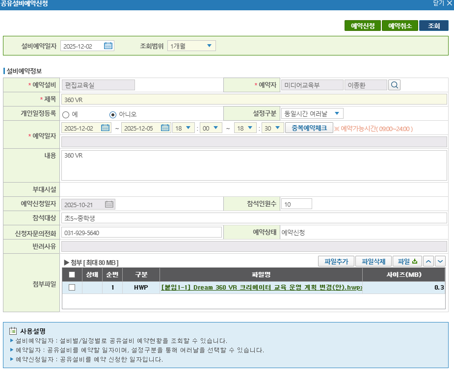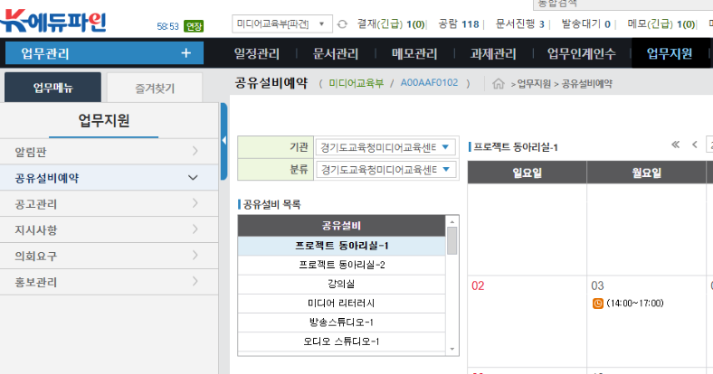 2. 업무지원 - 공유설비예약 - 해당 일자, 해당 강의실의 사용 시간에 맞도록 예약을 해줘야합니다.