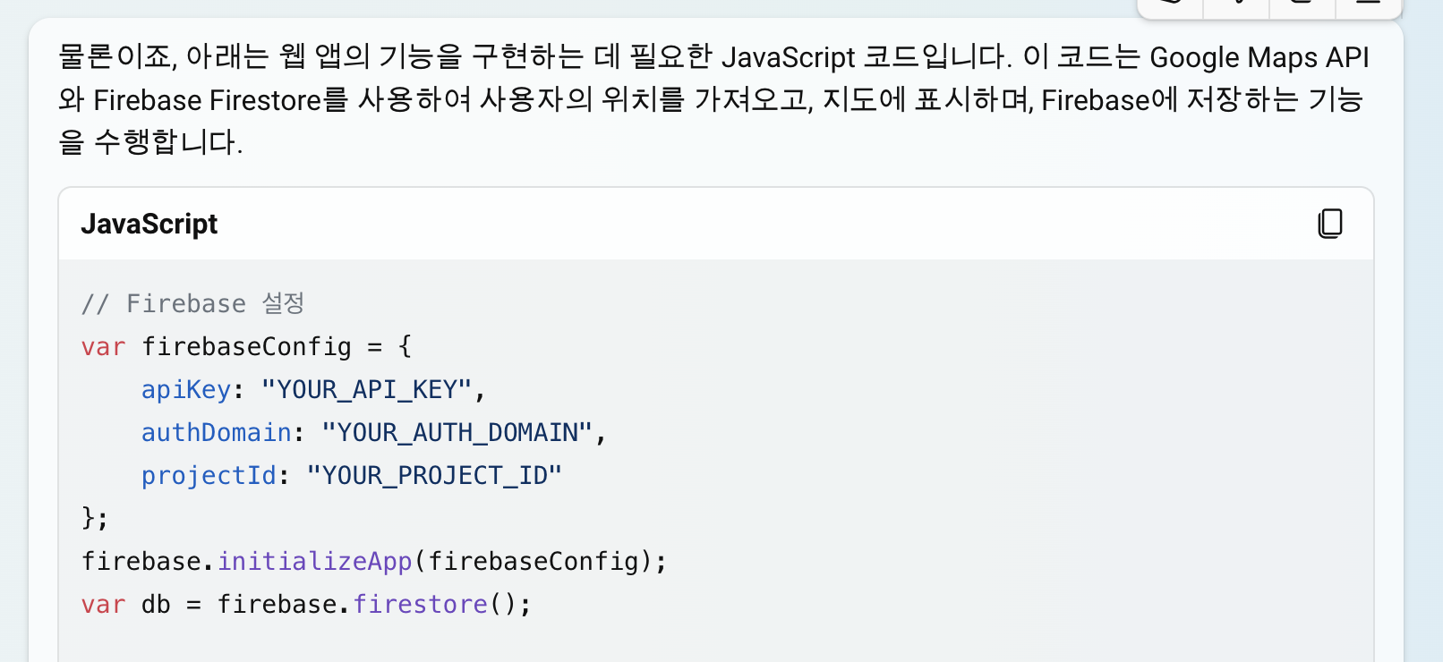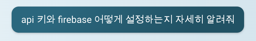 참고: 위의 절차는 기본적인 절차이며, 실제 설정은 사용자의 요구 사항에 따라 달라질 수 있습니다. 또한, API 키와 Firebase 설정은 민감한 정보이므로 안전하게 보관하고 공유하지 않도록 주의해야 합니다. 또한, 이러한 설정을 사용하여 개인 데이터를 수집하거나 처리할 때는 사용자의 동의를 받고 개인정보 보호 법률을 준수해야 합니다. 이러한 법률은 국가와 지역에 따라 다르므로, 해당 법률을 확인하고 준수하는 것이 중요합니다.